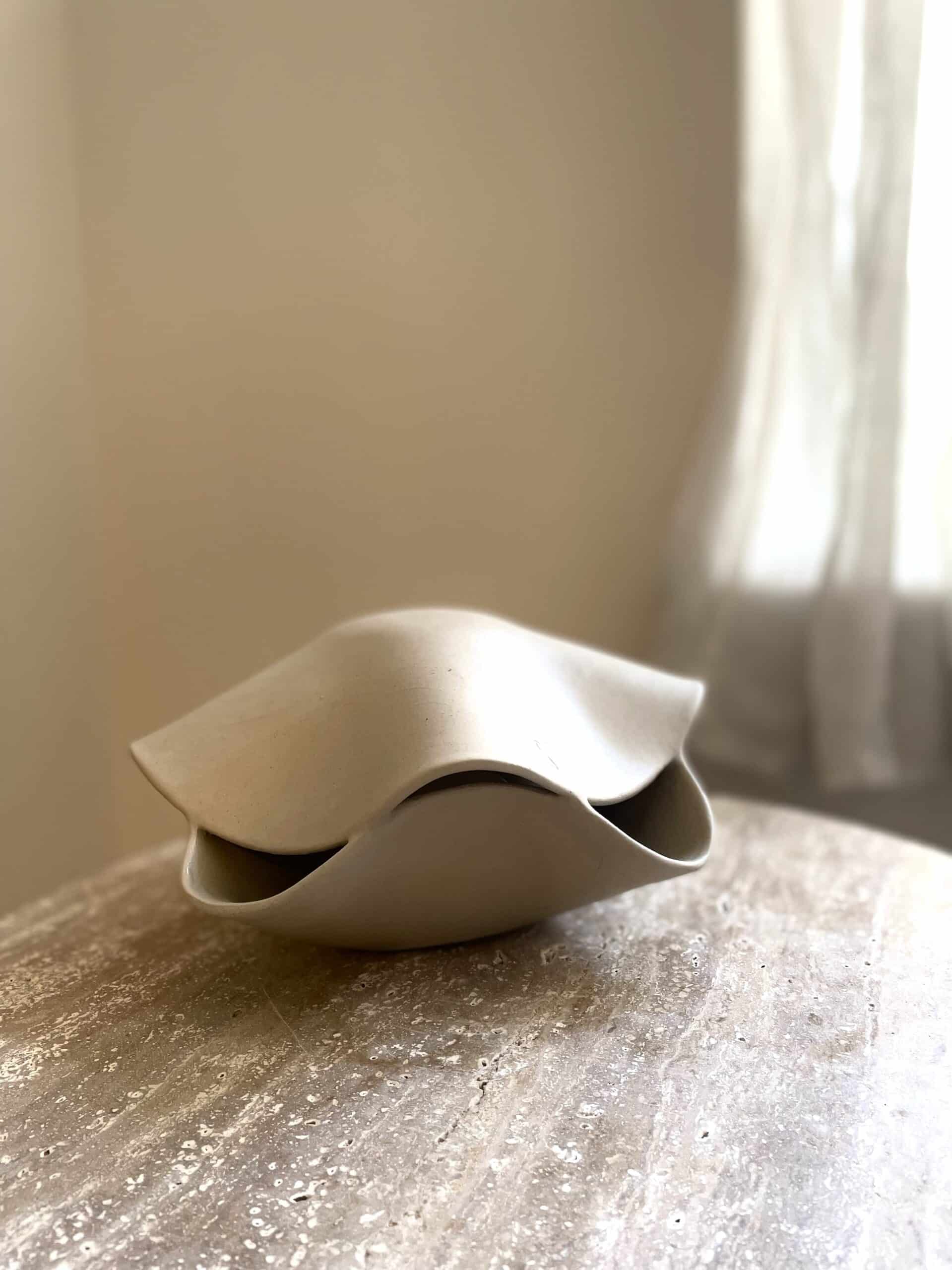 Sidonie façonne, émaille et cuit à deux reprises cette pièce en grès blanc jusqu’a 1200° avant de l’assembler entièrement à la main dans son atelier du Vieux-Lille, dans le nord de la France.