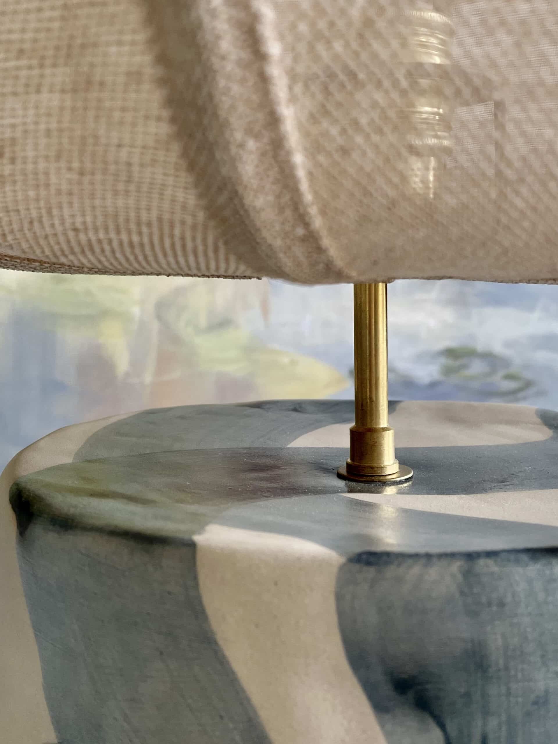 Elle se compose d’un abat-jour ballon en lin naturel, suspendu par un tube en laiton sur son pied rond émaillé et entièrement modelé à la main dans le Vieux-Lille.