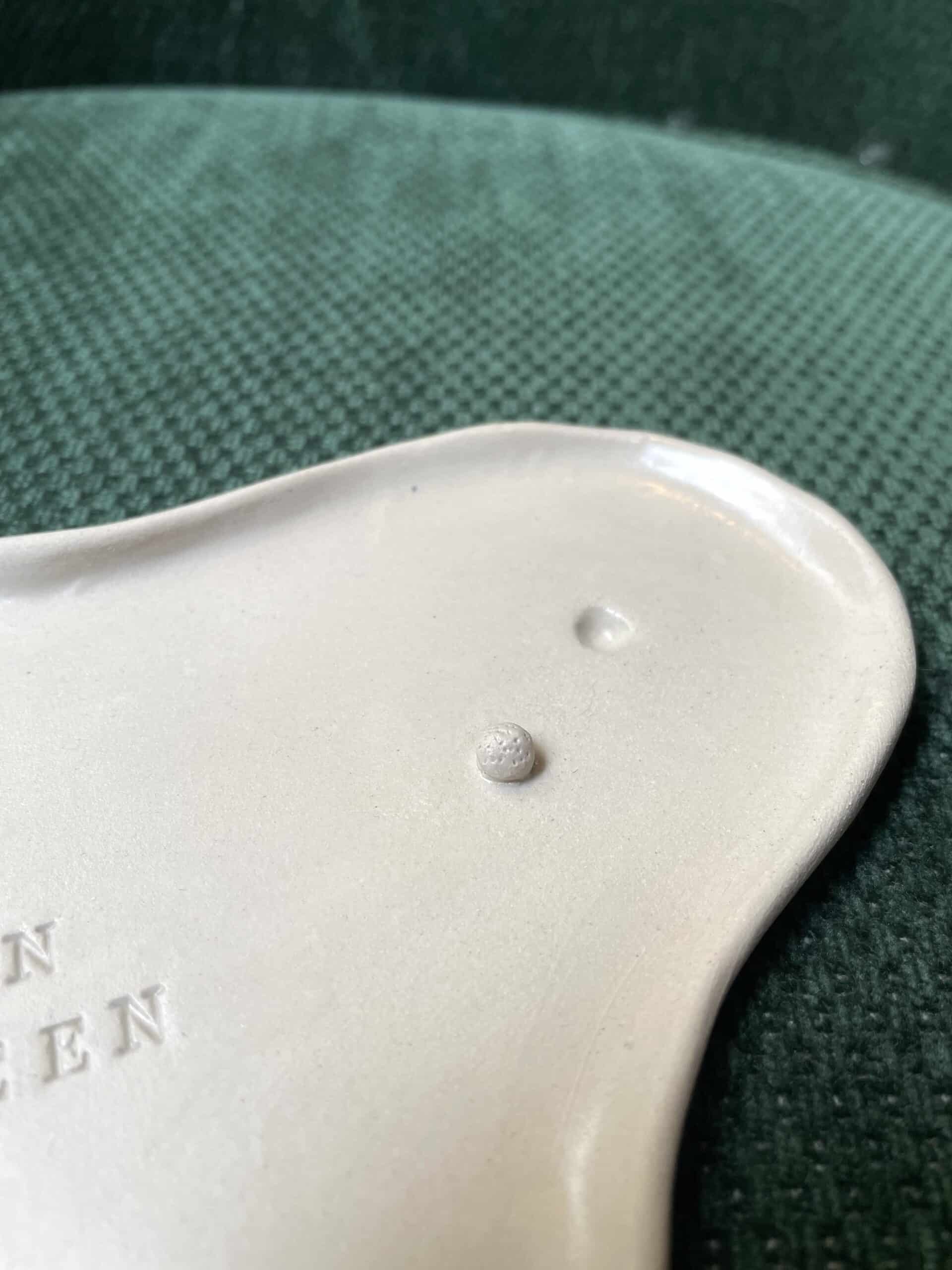 Modelée à la main en grès blanc, chaque pièce est unique. Sa silhouette douce s’inspire des courbes d’un green de golf, un clin d’œil à ce sport élégant que son père affectionne tant.